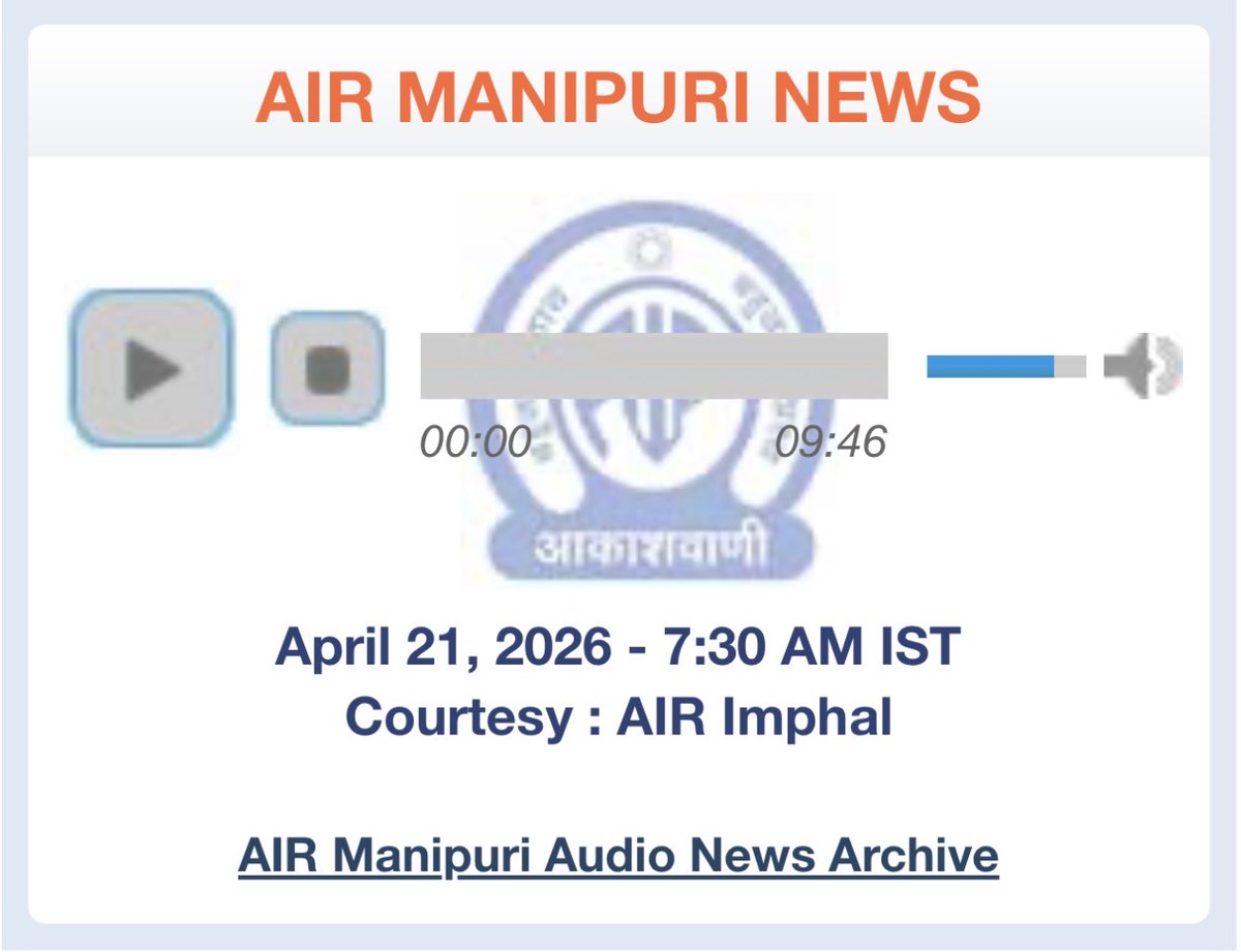 LISTEN: AIR Manipuri 7:30 AM for 21 April 2026 Listen @ https://bit.ly/2TLdFxC Tune into AIR Sangai Radio Channel – 24/7 LIVE Stream @ https://e-paolive.net/airimphal/ #AIRNews #ManipuriNews #AllIndiaRadioImphal #Manipur #Imphal
